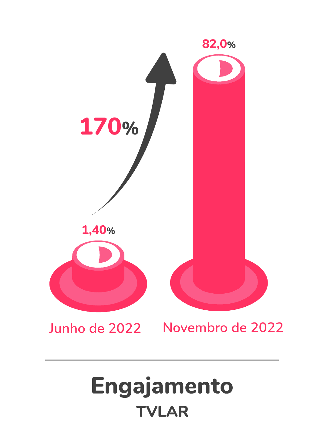 Todas as ações organizadas pelo Oto e TVLAR impactaram diretamente nos resultados do time de vendas usando o Oto, em especial no aumento do engajamento em conversas iniciadas pelos vendedores no app. Em junho, o engajamento nas campanhas da TVLAR era de 1,4% e chegou a 86% em outubro. Em novembro, devido às estratégias de Black Friday em loja, o engajamento nas campanhas ficou em 82%, mas ainda acima da média recomendada (80%) e garantindo um total de 21,3% da receita geral da marca atribuída aos contatos iniciados no Oto.