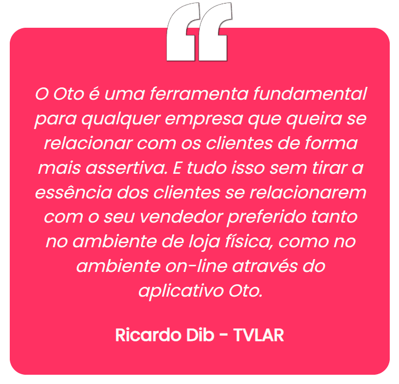 E o grande diferencial da TVLAR é o time altamente engajado. Hoje, a marca tem cases de sucesso entre seus próprios vendedores, como é o caso de um profissional que possui cerca de 70% das suas vendas atribuídas ao Oto. Ele garante esse resultado por meio da otimização do seu tempo, disponibilizando 50% da carga horária para atendimentos em loja, e 50% para os contatos pelo Oto, realizando também o atendimento e pós-venda de seus clientes nos canais digitais.